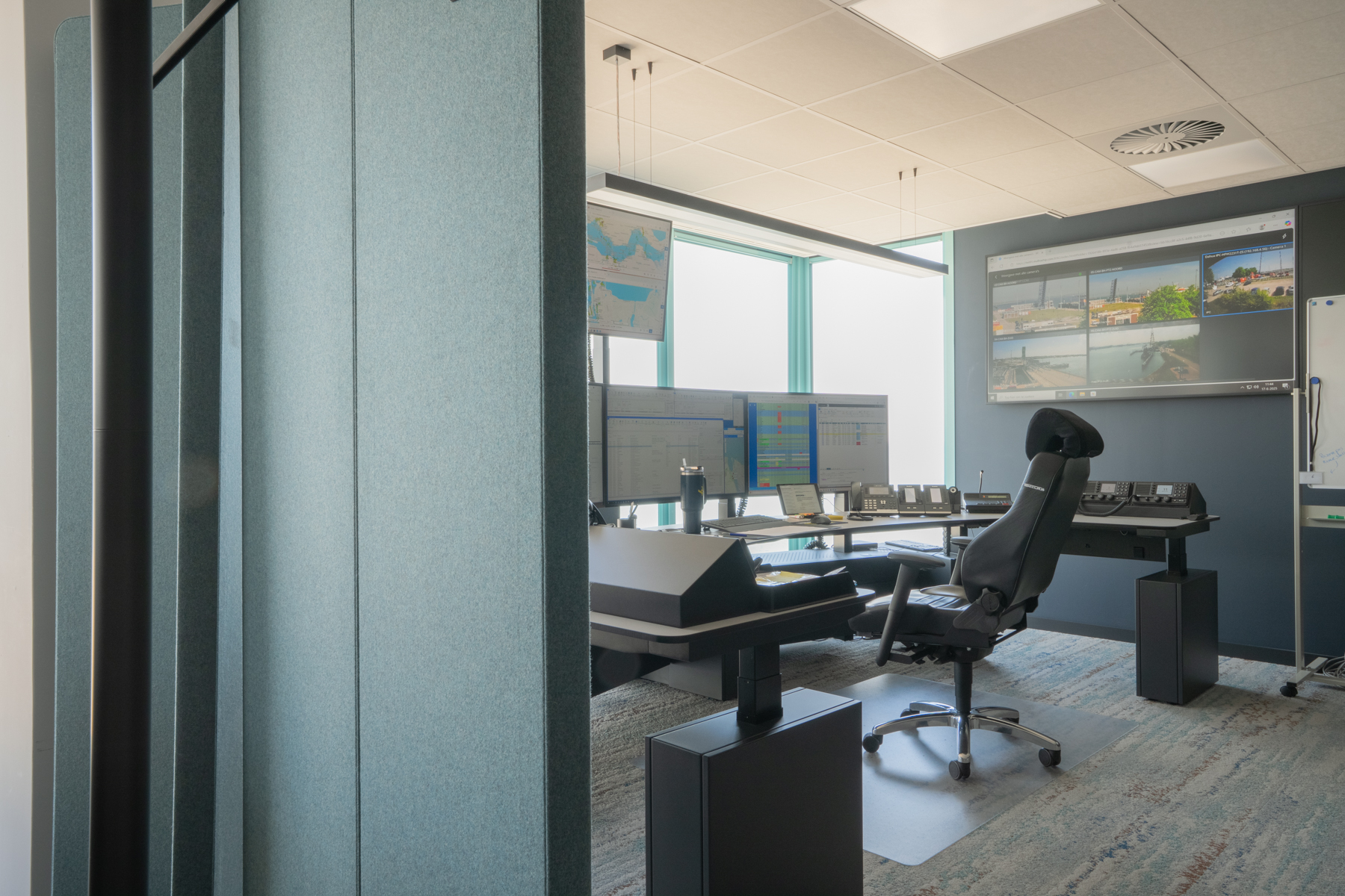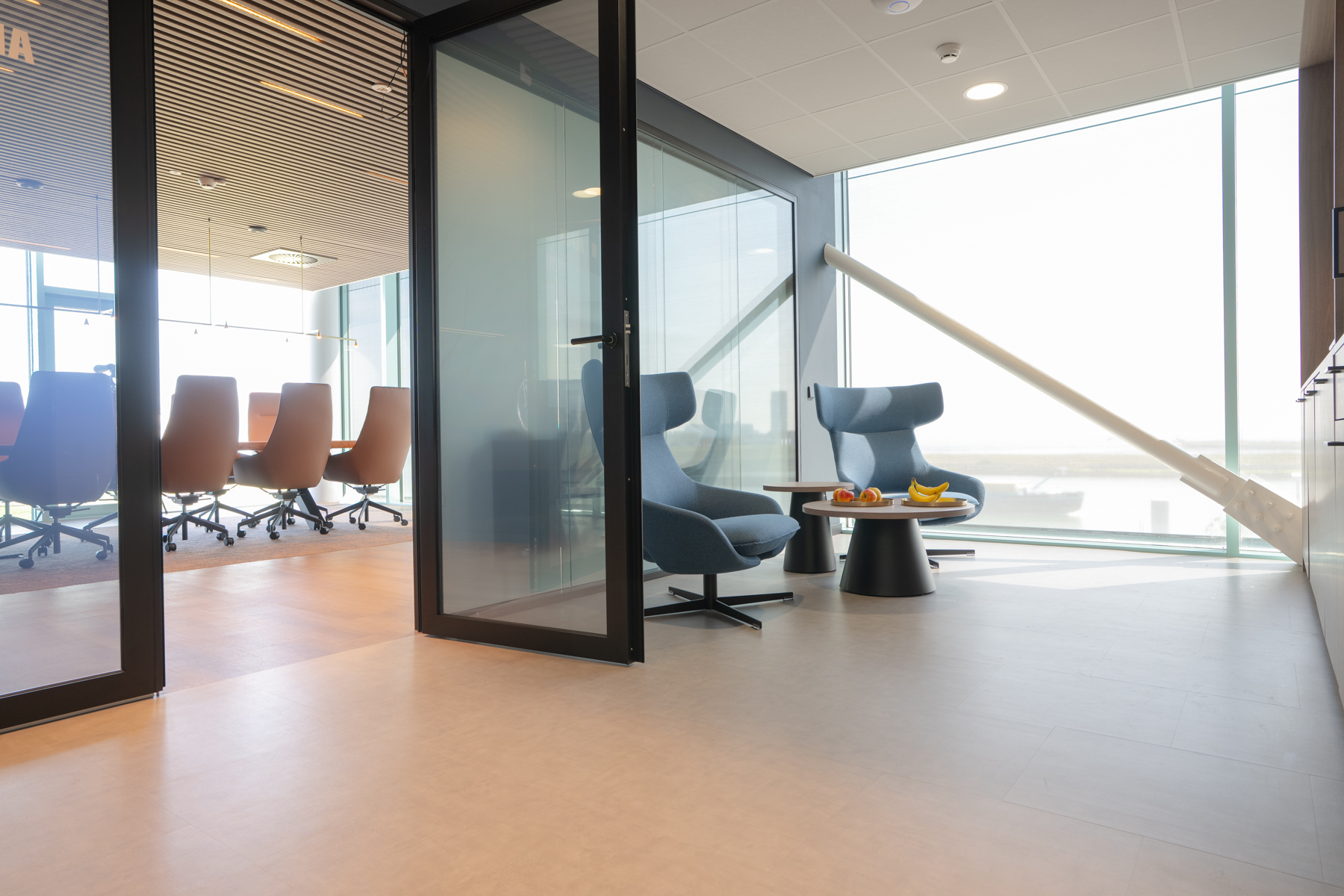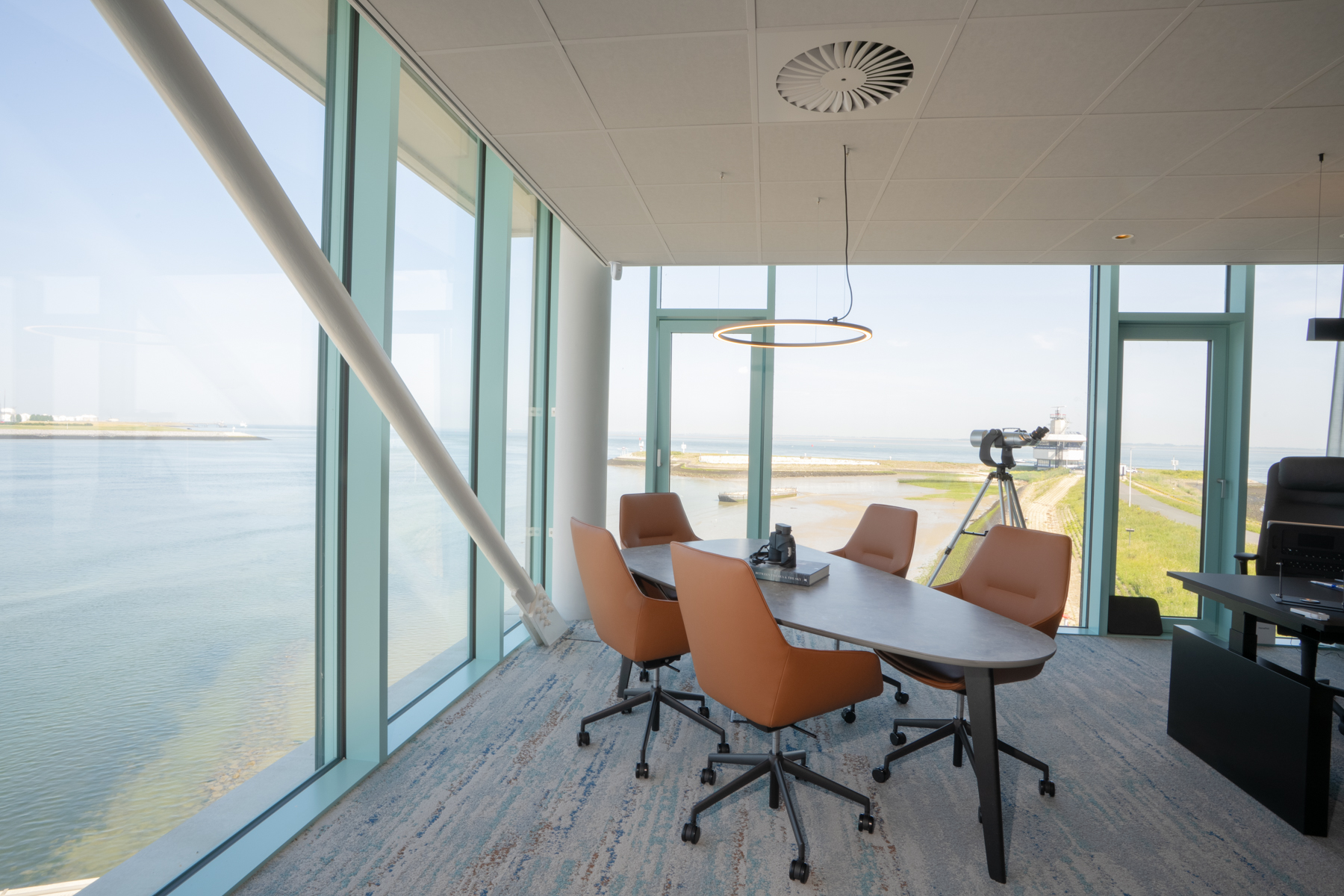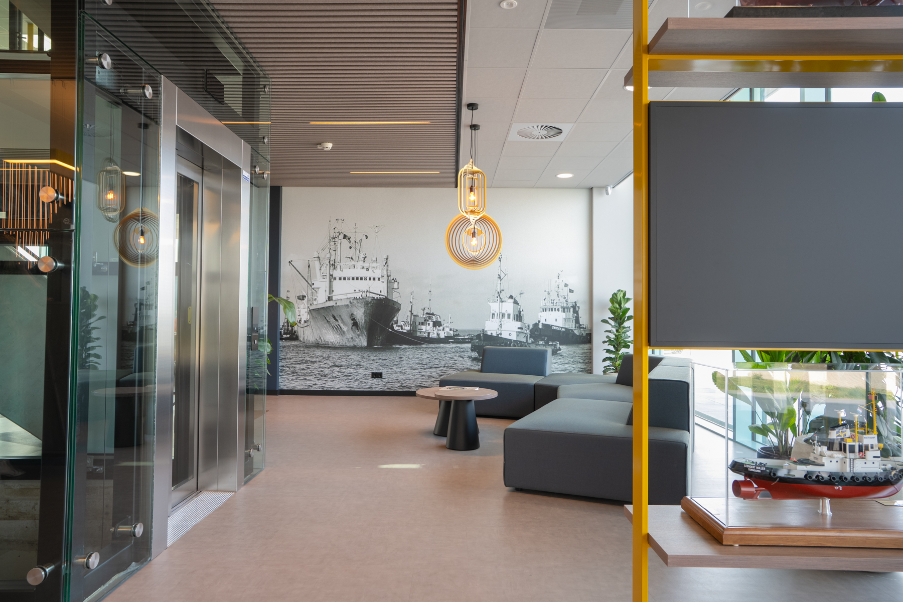 De boardroom werd het pronkstuk. Een op maat gemaakte boomstamtafel, een wand met viltbewerking van de Westerschelde en verlichting die het geheel samenbrengt. In de gangen kozen we beelden en objecten die het verhaal van Multraship vertellen. Een mix van trots, historie en toekomst.