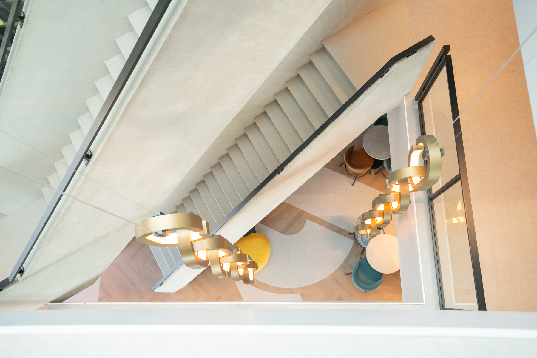 De entree zet de toon. Een balie met een lichtgevend logo in het materiaal. Stoer en subtiel tegelijk. Langs de trap lopen grote schakels als een ketting naar beneden. Een knipoog naar wat ze verbindt. De Multra Lounge werd ontworpen als het sociale hart van het kantoor. Geen kantine maar een plek waar je eet, overlegt of even tot rust komt. Hun kleuren zijn er subtiel in verwerkt en aangevuld met warme tinten die karakter geven. In het hele ontwerp staat gebruiksgemak centraal.