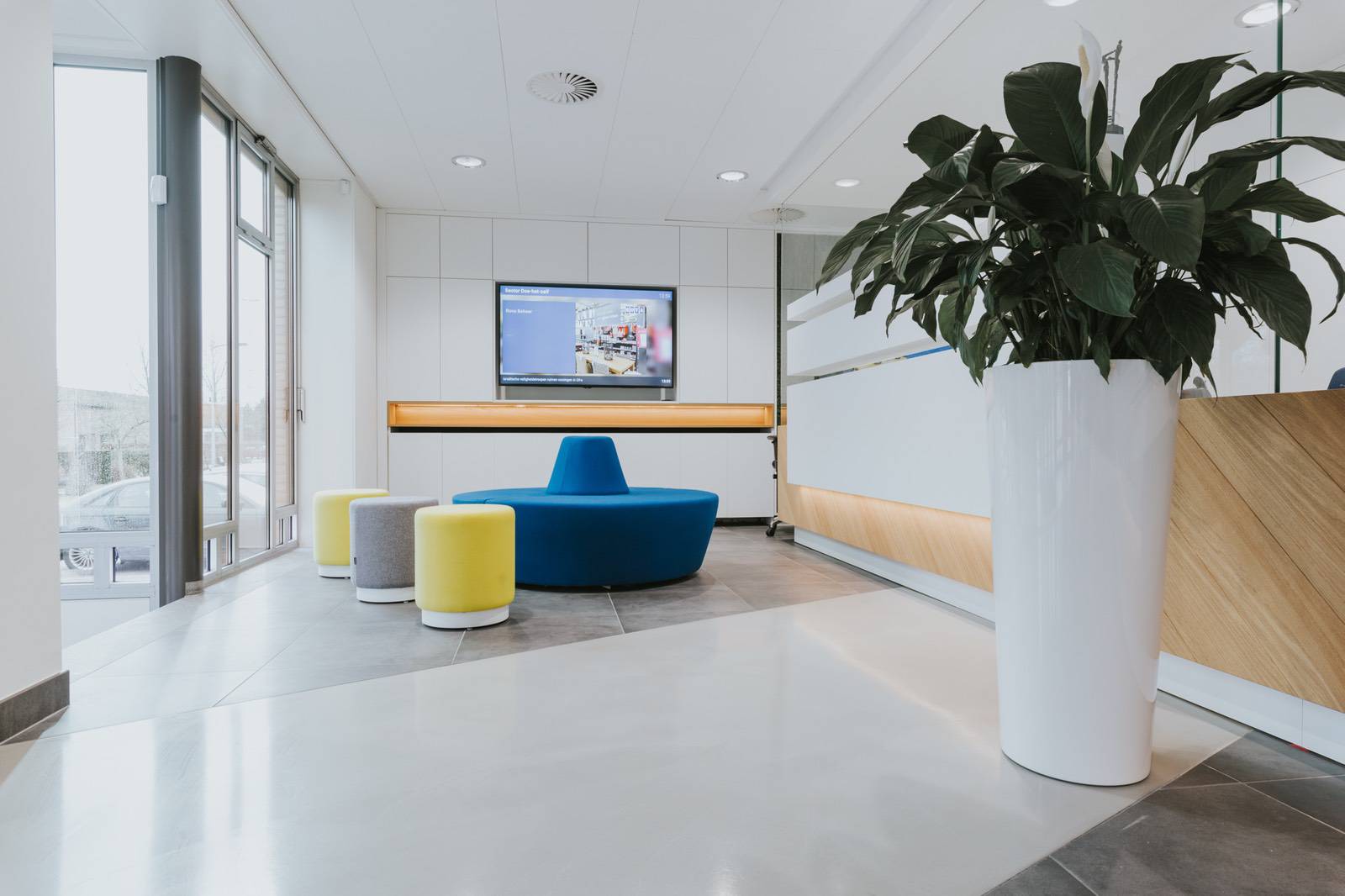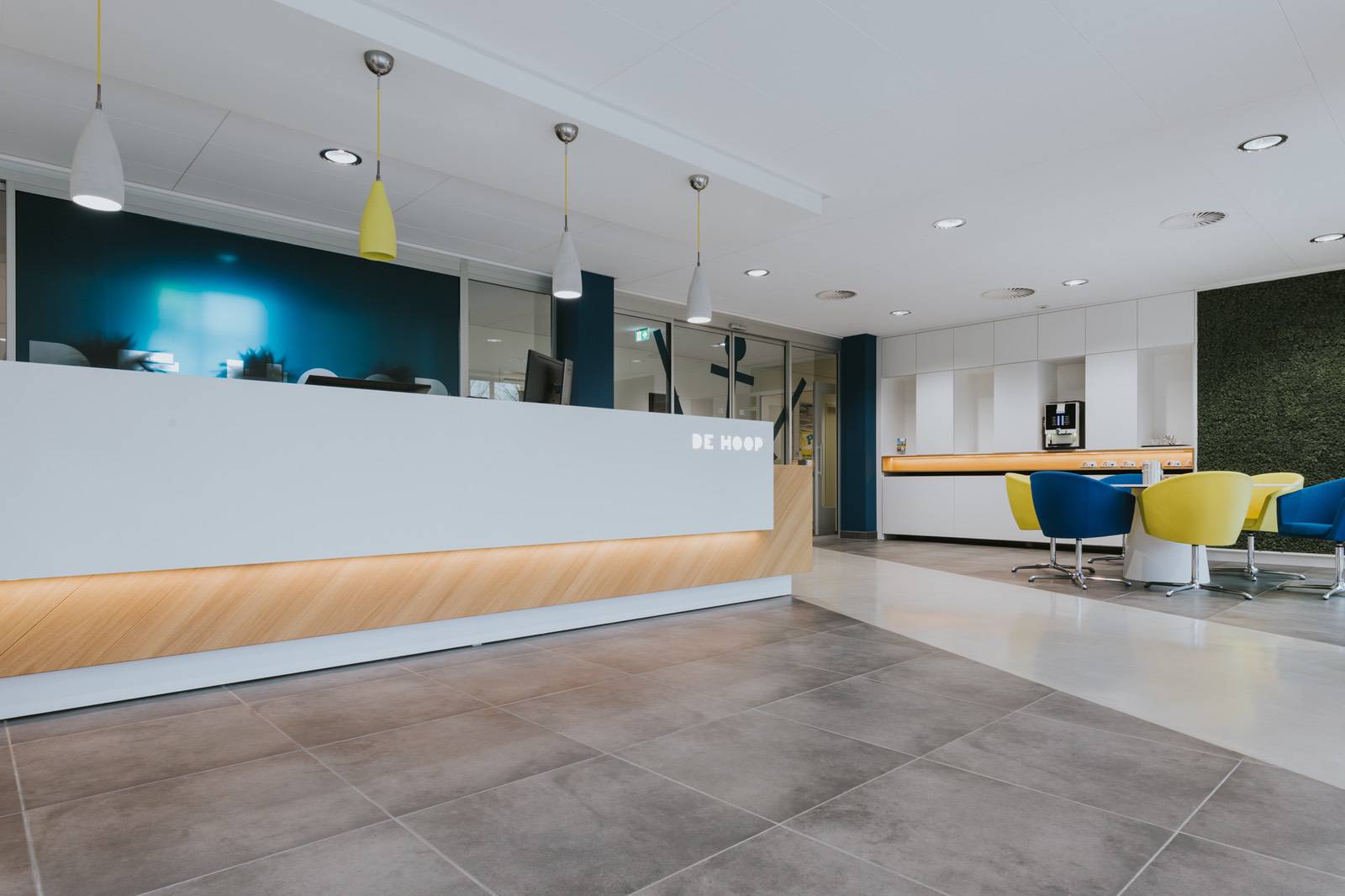 De kleuren van het bedrijf zien we terug in de zitjes met stoelen en bankjes in geel en blauw. We kozen hiervoor voor de hoogwaardige merken van Lande, Artifort en Moooi. Het ronde zitmeubel van Wini en de betonnen lampen met één geel exemplaar vormen een leuk detail dat goed past bij de producten en diensten van De Hoop.